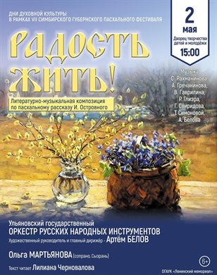 В этот день зрители услышат литературно-музыкальную программу, основу которой составляет пасхальный рассказ Ивана Островного «Радость жить», проиллюстрированный вокальными и инструментальными шедеврами русских и советских классиков. Среди произведений – «Сон», «Светлый праздник», «У моего окна», «Здесь хорошо, «Они отвечали», «Вокализ» Сергея Рахманинова, «Вербочки», «Пастораль», «Отчалившая Русь» (№ 5) Георгия Свиридова, «Марш» Валерия Гаврилина, «Как ангел неба безмятежный» Александра Гречанинова и другие.