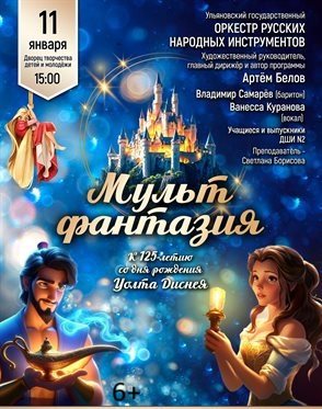 11 января в 15:00 во Дворце творчества детей и молодёжи Ульяновский государственный оркестр русских народных инструментов под руководством художественного руководителя и главного дирижёра Артёма Белова исполнит концерт, посвящённый 125-летию со дня рождения Уолта Диснея. В программе примут участие солисты Владимир Самарёв, Алена Тюрина и Ванесса Куранова (6+).
