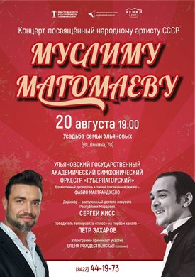 20 августа в 19:00 в Усадьбе семьи Ульяновых (город Ульяновск, улица Ленина, дом 70) состоится концерт «Посвящается М», посвященный памяти Муслима Магомаева.