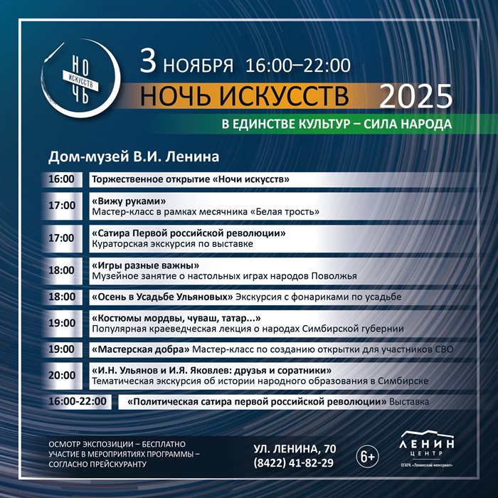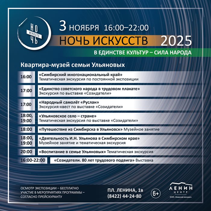 Квартира-музей семьи Ульяновых (адрес: площадь Ленина, 1в) свою музейную программу в 16.00 начинает с тематической экскурсии «Симбирский многонациональный край». Расположившаяся сразу на двух этажах выставка «Созидатели. 80 лет трудового подвига» станет местом проведения самых разнообразных событий этого вечера: экскурсии «Единство советского народа в трудовом плакате» (17.00), премьерной экскурсии-квеста «Народный самолёт «Руслан» (17.00), экскурсии «Ульяновское село – стране» (18.00 и 19.00).