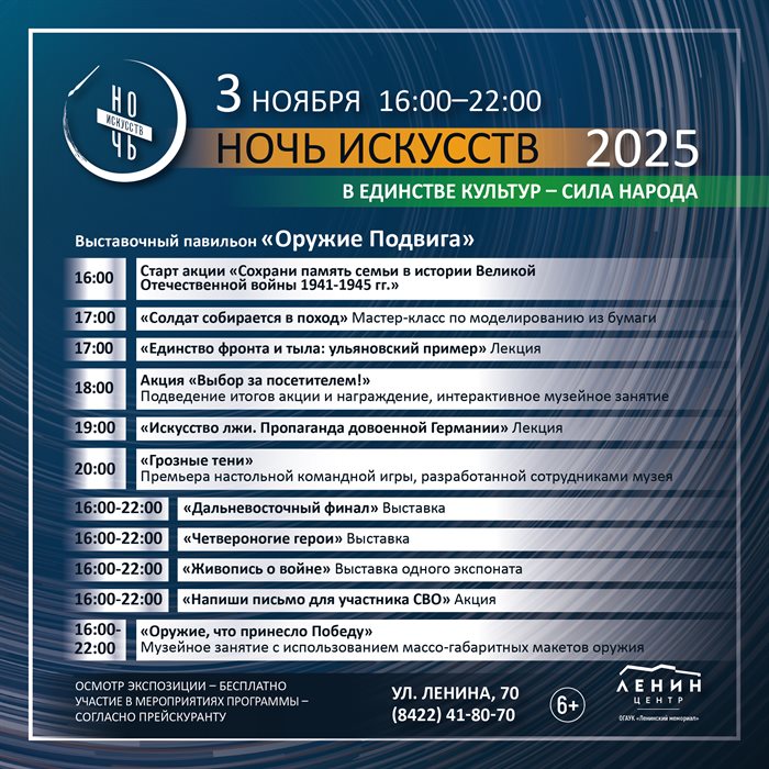 Другая акция «Выбор за посетителем» в 18.00, напротив, подойдет к своему завершению. Суть ее в выборе читателями социальных сетей одной из трёх картин о Великой Отечественной войне, которая по результатам народного голосования будет представлена на выставке одного экспоната. Для каждой из картин подготовлено отдельное интерактивное занятие. Среди участников голосования и посетителей будет проведен розыгрыш призов. Участие в этих мероприятиях-акциях бесплатно для всех посетителей. Конечно, вечер в выставочном павильоне традиционно сложно представить без лектория: в 17.00 слушателей ждёт лекция «Единство фронта и тыла. Ульяновский пример», в 19.00 – лекция «Искусство лжи. Пропаганда довоенной Германии», где посетителям представят новейшие поступления, новые экспонаты музея. Для детей сотрудники музея подготовили в 17.00 мастер-класс по моделированию из бумаги «Солдат собирается в поход». Детям и молодежи будет интересна премьера настольной игры «Грозные тени», участие в этой игре бесплатно для посетителей. В этот вечер в музее можно будет увидеть выставку реконструкторов «Военная медицина», выставки от Музея Победы «Дальневосточный финал» и «Четвероногие герои», выставку одного экспоната в рамках акции «Выбор за посетителем».