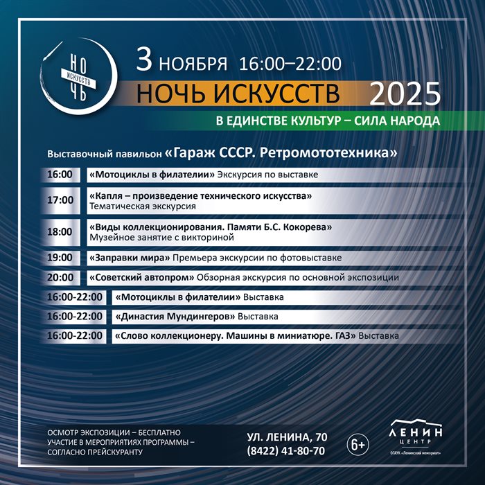 Выставочный павильон «Гараж СССР. Ретромототехника» (адрес: улица Ленина, 70) представит сразу несколько мини-выставок: «Слово коллекционеру. Машины в миниатюре. ГАЗ», «Династия Мундингеров», «Заправки мира», «Мотоцикл в филателии». В 16.00 откроет программу экскурсия по филателистической выставке, в 17.00 посетителей приглашают к беседе об уникальном экспонате музея – автомобиле «Капля». В 18.00 пройдет музейное занятие «Виды коллекционирования. Памяти Б.С. Кокорева», в ходе которого гостей павильона ожидает викторина с призами. Участие в этом мероприятии бесплатно для всех посетителей. В 19.00 состоится премьера экскурсии по выставке «Заправки мира», все пришедшие на нее вместе с сотрудниками музея пройдут от истоков – аптеки – до современного придорожного «топливного» сервиса. В 20.00 обзорной экскурсией по павильону будет завершена программа мероприятий.