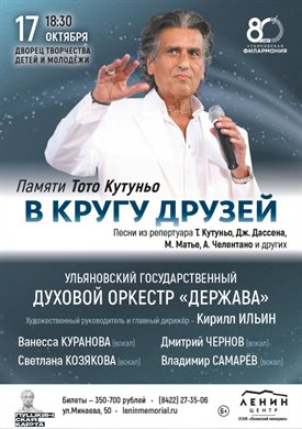 17 октября в 18.30 во Дворце творчества детей и молодежи Ульяновский государственный духовой оркестр «Держава» под управлением художественного руководителя и главного дирижера Кирилла Ильина исполнит песни из репертуара Т. Кутуньо, Дж. Дассена, М. Матье, А. Челентано и других. В их числе всемирно популярные хиты L`italiano; Amore no; Stivalli e colyache; Ciao, bambino, sorry; L’ete Indien и другие.