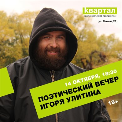 В Ульяновске, в креативном бизнес-пространстве «Квартал» (ул. Ленина, 78) пройдет поэтический вечер ульяновского поэта Игоря Улитина.