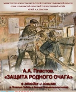 На этой исторической выставке А.А. Пластов представил «Немец пролетел», «К партизанам», и - «Защита родного очага». Последнее произведение в военные годы было утеряно, однако сохранился эскиз и 19 этюдов именно к этой картине. Они помогают представить замысел великого художника.