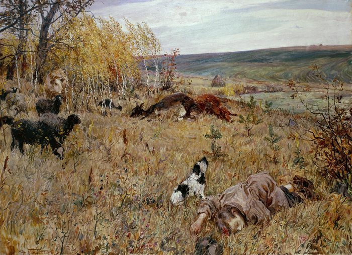 Пластов живет с мыслью о Нестерове, обращается к его работам, особо к «Видению отроку Варфоломею» (1889-1890). Нестеровский отрок – будущий Сергий Радонежский – получает из рук старца-черноризца частицу просфоры в знамение благодати Божией и разумение Святого Писания. Это символ духовного возрождения, воплощение надежды на будущее. Написание осенью 1942 года картины «Немец пролетел» почти мистически совпадает с уходом М.В. Нестерова – он скончался 18 октября этого года. Картина Пластова «Немец пролетел» наполнена нестеровской поэтикой: и образ мальчика-пастушка, и пейзаж, и вырастающий из него эпический образ Родины… Пластов, удивительно точный в деталях, словно цитирует фрагменты нестеровского полотна, помещает на первом плане молодые сосенки, оброненный кнут, ассоциирующийся с конной упряжью в руках отрока Варфоломея…
