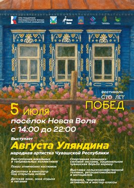 5 июля в селе Новая Воля Цильнинского района состоится межрегиональный культурно-просветительский фестиваль «100 лет побед», приуроченный к 100-летнему юбилею основания посёлка. Специальный гость – народная артистка Чувашской Республики Августа Уляндина.
