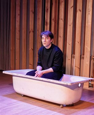 Самая неудобная фигура этой истории - бабушка Саши Савельева - существует лишь с вербальной подачи Савельева-Дементьева. И режиссеру Мельникову важно, чтобы чересчур громкие звуки или резкие движения не отвлекали от главного. Отсюда сценические средства: и минимализм а-ля Театр на Таганке с единственным партнером Дементьева - ванной-трансформером, и будто специально нарочитый черный прикид главного героя.