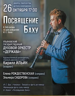26 октября в 17:00 Ульяновский государственный духовой оркестр «Держава» под руководством художественного руководителя, главного дирижера, автора аранжировок и солиста Кирилла Ильина выступит во Дворце творчества детей и молодежи (6+).