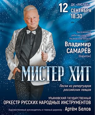 12 сентября в 18:30 в ДК «Руслан» пройдет концерт под названием «Мистер Хит» (12+), которую представят Владимир Самарёв и Ульяновский государственный оркестр русских народных инструментов под управлением дирижера из Санкт-Петербурга Снежаны Сугробовой.