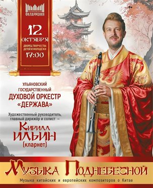 «Программа включает в себя народную музыку и сочинения композиторов Китая, а также произведения авторов из других стран, вдохновившихся китайской экзотикой. Исполнитель - Ульяновский государственный духовой оркестр «Держава», художественный руководитель и солист - Кирилл Ильин (кларнет). Представит программу искусствовед Лариса Куфтина», – сообщили в филармонии.