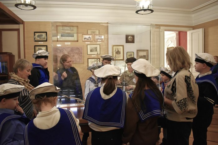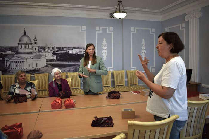 Глухие и слабослышащие экскурсанты получили в подарок сувениры - платки с изображением цветов граната (узор взят с одной из шкатулок, привезенных И.А. Гончаровым из Японии) и салфетки с изображением фрегата «Паллада». Подарки были изготовлены партнером проекта.
