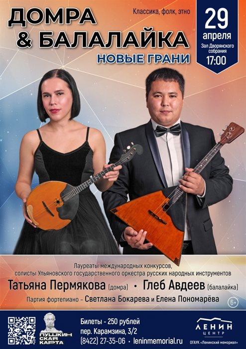 В субботу в 17.00 в зале дворянского собрания состоится «Парад солистов: домра & балалайка» (6+). Его представят лауреаты международных конкурсов, солисты Ульяновского государственного оркестра русских народных инструментов Татьяна Пермякова (домра) и Глеб Авдеев (балалайка). Партия фортепиано – Светлана Бокарева и Елена Пономарёва. Вместе они исполнят темпераментную «Пляску цыганок» из оперы «Алеко», пьесу «Кол Нидрей» немецкого композитора Макса Бруха и т.д.