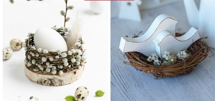 Великолепно будет украшать подоконник зеленый лук, пророщенный не в обычной пропитанной водой вате, а внутри специальных мешочков, пошитых в форме моркови. Яркая и оригинальная идея точно не оставит равнодушных и среди деток, и среди взрослых. Также предлагаем вам варианты небольших композиций-гнезд, внутри которых можно или положить красиво украшенное яичко, или посадить пару птичек из дерева.
