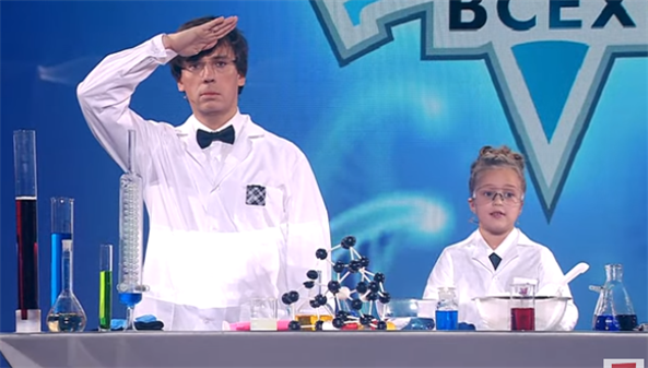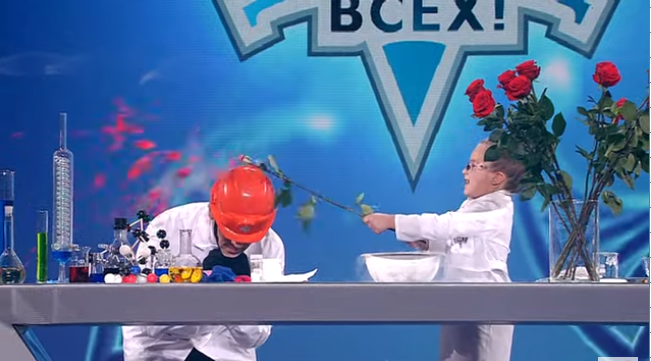 На всеобщее обозрение Вера Панченко представила пять опытов: сухой лед, мыльные пузыри, зубная паста для слона, искусственный снег и хрустальная роза. Последнюю она отважно разбила о голову Максима Галкина.