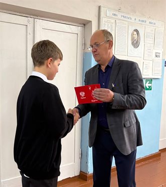На торжественной линейке в Юрловской основной школе директор образовательной организации, депутат Совета депутатов Базарносызганского муниципального округа Ульяновской области Геннадий Борисович Каляев вручил юному гражданину России главный документ гражданина Российской Федерации.