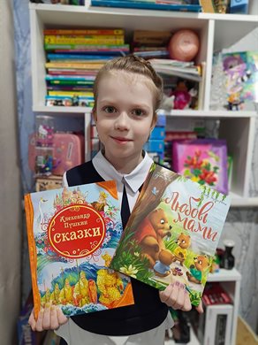 «Мой стаж чтения не так и велик. Очень нравится читать «Сказки» А. С. Пушкина, это моя одна из самых любимых книг. Мама часто дарит мне книги. Я уже читала таких писателей, как А. С. Пушкин, К. И. Чуковский, А. Л. Барто, Л. Н. Толстой, Г. Х. Андерсен, Е. А. Ульева, братья Гримм. По секрету скажу, мне больше нравится слушать, когда мне читают. Если бы мне посчастливилось встретиться с любимым писателем А. С. Пушкиным, я бы у него спросила: «Как у вас получается придумывать сказки?» А еще я хочу, как в сказке, поймать золотую рыбку и исполнить свои мечты и мечты моей семьи».