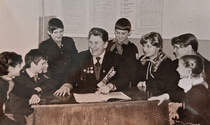 Александр Иванович Сенаторов, ветеран Великой Отечественной войны, участник Парада Победы на Красной площади в Москве, знакомит учащихся со своим поэтическим творчеством
