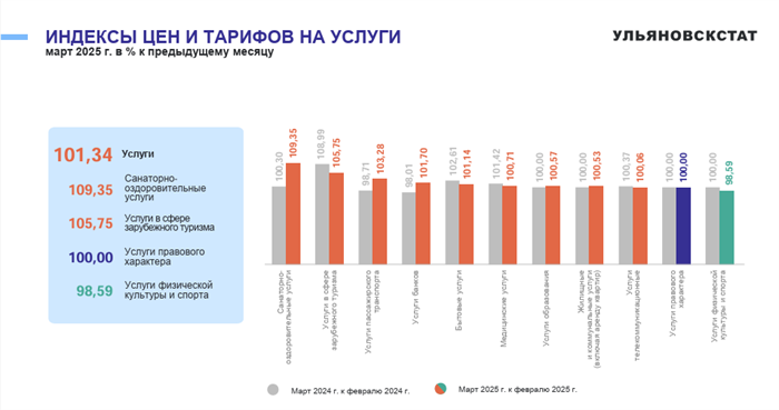 Дороже в марте стали в Ульяновской области и многие другие услуги. К примеру, на 3,28% подорожали поездки в транспорте, на 1,7% стали дороже банковские кредиты. Больше стали платить ульяновцы за услуги в сфере ЖКХ, а также за медицинские, образовательные, бытовые и телекоммуникационные услуги.