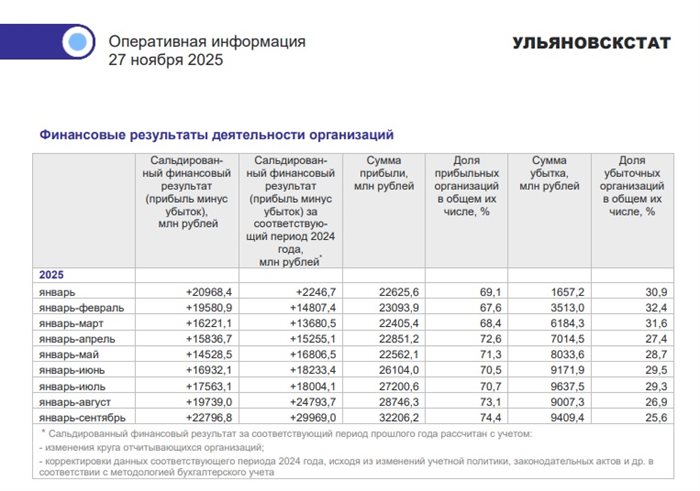 Ульяновскстат опубликовал данные о финансовых результатах предприятий в Ульяновской области за период с января по сентябрь 2025 года.
