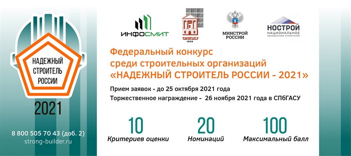 Торжественная церемония награждения победителей состоится 26 ноября 2021 года на площадке СПбГАСУ в рамках делового съезда «Надежный строитель России».