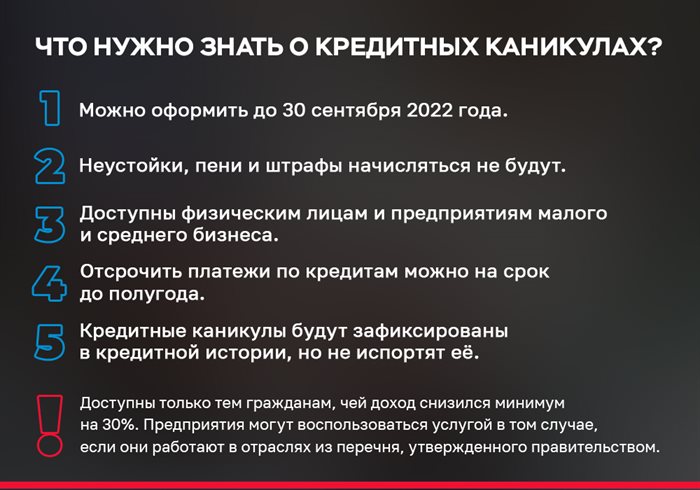 5. Если нечем платить по долгам, то есть возможность взять передышку – воспользоваться кредитными каникулами. По закону о них до 30 сентября граждане и предприятия малого и среднего бизнеса могут подавать требования об отсрочке платежей по кредитам и займам на срок до полугода. Граждане вправе подать такое требование, если они столкнулись с существенным снижением своих доходов (как минимум на 30%), а бизнес — если он работает в отраслях из перечня, утвержденного правительством. В период кредитных каникул прекращается начисление неустоек, пеней и штрафов, кредитор не имеет права продать квартиру или машину, которые находятся у него в залоге. Кредитные каникулы будут зафиксированы в кредитной истории, но не испортят ее. Помимо каникул, по закону можно провести реструктуризацию на условиях банка или МФО. Главное – сразу сообщите кредитору, что попали в трудную жизненную ситуацию, и обсудите возможные варианты. В пандемию этот механизм помог большинству заемщиков после временных трудностей вернуться в график платежей.