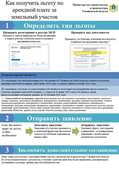 - В частности, принято решение о предоставлении отсрочки уплаты арендных платежей. В соответствии с Распоряжением Правительства Ульяновской области от 24.03.2020 № 120-пр «О некоторых мерах имущественной поддержки субъектов малого и среднего бизнеса» арендаторам земельных участков, находящихся в собственности Ульяновской области, предоставляется право отсрочить уплату арендной платы, предусмотренной в 2020 году, на период до 2021 года, - поясняют в департаменте земельных отношений Ульяновской области. - Распоряжением Правительства Ульяновской области от 08.05.2020 № 245-пр «О некоторых мерах имущественной поддержки субъектов малого и среднего предпринимательства» предоставляется отсрочка уплаты арендной платы, предусмотренной в марте - мае 2020 года, и её уплату в сроки, предусмотренные договором аренды до 30.10.2020, по договорам аренды земельных участков, государственная собственность на которые не разграничена, расположенных в границах муниципального образования «город Ульяновск».