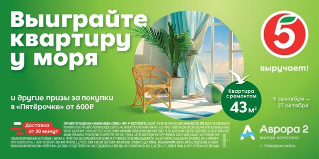Торговая сеть «Пятёрочка» объявляет о запуске акции «Выиграйте квартиру у моря». Главный приз — квартира в Новороссийске, которая станет для победителя воплощением мечты о собственном жилье на побережье.