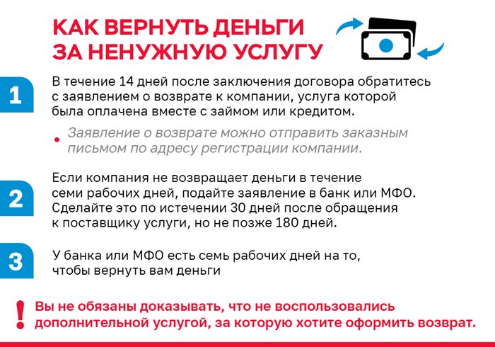И тоже в течение семь рабочих дней вам обязаны вернуть деньги. Важно знать и помнить, что заемщик не обязан доказывать факт того, что он не воспользовался дополнительной услугой, за которую хочет вернуть деньги.