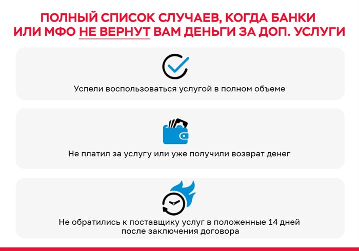 Если банк или МФО безосновательно отказываются возвращать деньги за дополнительную услугу, тоже действуйте! В законе есть исчерпывающий список случаев, когда банк или МФО вправе отказать в этом. И пунктов в нем не так уж много:
