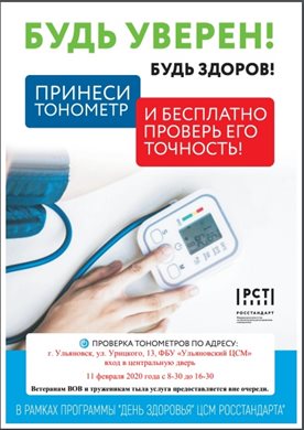 В день акции с 8.30 до 16.30 по адресу: г. Ульяновск, ул. Урицкого, 13 специалисты ФБУ «Ульяновский ЦСМ» на безвозмездной основе будут вести прием граждан для проведения контроля выходных параметров бытовых тонометров артериального давления, используемых населением.