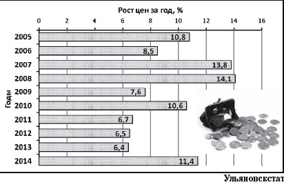 В 2014 году в Ульяновской области сложился самый высокий уровень инфляции за последние шесть лет и составил 11,4%, за 2013 год - 6,4% (по России инфляция за 2014 год - 11,4%, за 2013 год - 6,5%).