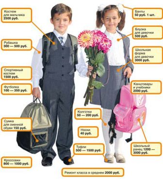 А еще ребенка надо одеть, обуть, повесить на плечи рюкзак с мультяшными героями, старшеклассницам так и вовсе купить сумочку а-ля Шанель. Введенная школьная форма значительно облегчает выбор одежды, ГОСТы на состав для нее, похоже, так же в прошлом, как и накрахмаленные передники. Комплект школьной формы обойдется в среднем в 5000 рублей, цена зависит от возраста ребенка и фирмы-производителя. Но к основной форме прилагается обувь, в том числе сменная, кроссовки, спортивный костюм для занятий физкультурой и много другой разной мелочи, из которой складывается пазл школьных годов чудесных.
