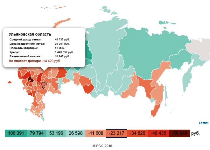 Карту доступности ипотеки для жителей России составил «РосБизнесКонсалтинг». По расчетам аналитиков, среднестатистической ульяновской семье не хватает более 14 тысяч рублей дохода для того, чтобы безболезненно взять жилищный кредит. Специалисты говорят, что «безболезненным» считается такой расклад, когда на ежемесячные ипотечные взносы тратится не более тридцати процентов семейного бюджета.