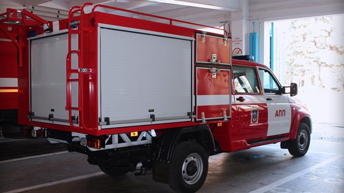 Утепленный фургон из алюминия получил оснащение по типу «рольставни» по бортам, а также на стенке в задней части кузова. При этом сдвижную площадку на крыше авто укомплектовали креплениями для трехколенной лестницы. Часть внутреннего пространства предназначена для бака с водой и емкость с пенообразователем с рабочим объемом на 300 и 30 литров, а также насосный комплекс повышенного давления, рассчитанного на 35 л/мин.