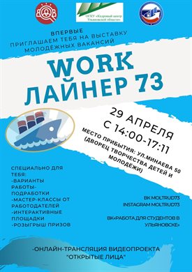 Молодёжный центр трудоустройства «Кадровый центр Ульяновской области» приглашает всех желающих на «Work-Лайнер73», который пройдёт 29 апреля с 14:00 до 17:00 во Дворце творчества детей и молодёжи (Ульяновск, улица Минаева, 50).