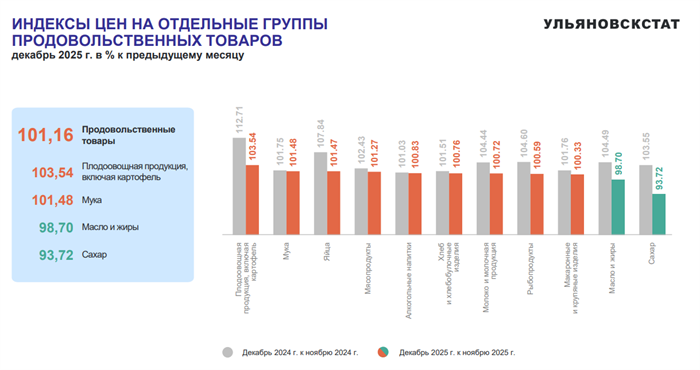 Но не все продукты в прошлом месяце подорожали. Снизились цены на капусту, лук, свеклу, груши, апельсины, лимоны, сахар… Так, например, средняя цена за килограмм сахара в магазинах Ульяновской области в декабре 2025-го составила 59 рублей. Это тоже рекорд года, но со знаком плюс. Так дешево этот продукт в предыдущие месяцы не продавался.