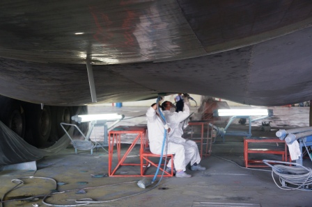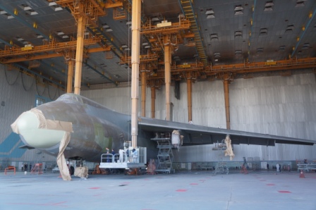 В настоящее время завершаются работы по удалению старого лакокрасочного покрытия, устранение коррозии и ведется подготовка дополнительной герметизации наружных заклепов, после чего (ориентировочно сегодня, во вторник - Авт.) начнется процесс окраски воздушного судна в цвета Минобороны.