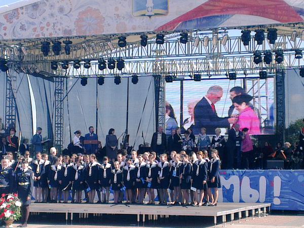 Сергей Морозов отметил, в годы ВОВ Ульяновск вошел в историю как город трудовой славы, которым его сделали труженики тыла и передал городу Знамя трудовой славы. А затем  прошла церемония награждения ветеранов труда. Отличившиеся школьники получили в торжественной обстановке паспорта граждан России. Завершилась официальная церемония открытия Дня города праздничным концертом.