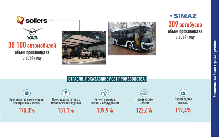 38 тысяч автомобилей, а производственная мощность нового предприятия «Соллерс Комтранс» составляет дополнительно 5 тысяч автомобилей в год. СИМАЗ, выпускающий пассажирские автобусы, нарастил выпуск продукции в 2,5 раза.