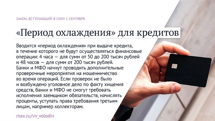 Вводится «период охлаждения» при выдаче кредита, в течение которого не будут осуществляться финансовые операции: 4 часа — для сумм от 50 до 200 тысяч рублей и 48 часов — для сумм от 200 тысяч рублей. Банки и МФО начнут проводить дополнительные проверочные мероприятия на мошенничество при проведении операций. Если проверок не было и возбуждено уголовное дело по факту хищения средств, банки и МФО не смогут требовать исполнения заемщиком обязательств, начислять проценты, уступать права требования третьим лицам, например коллекторам.