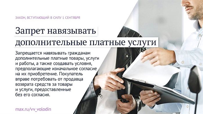 Запрещается навязывать гражданам дополнительные платные товары, услуги и работы, а также создавать условия, предполагающие изначальное согласие на их приобретение. Покупатель вправе потребовать от продавца возврата средств за товары и услуги, предоставленные без его согласия.