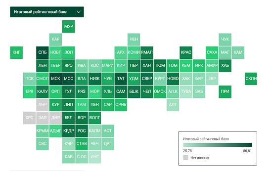 Лидируют с большим отрывом Москва (86,81 балла) и Санкт-Петербург (85,00). На третьем месте Московская область (81,88), на четвертом Татарстан (78,16), замыкает пятерку лидеров Свердловская область (70,64).