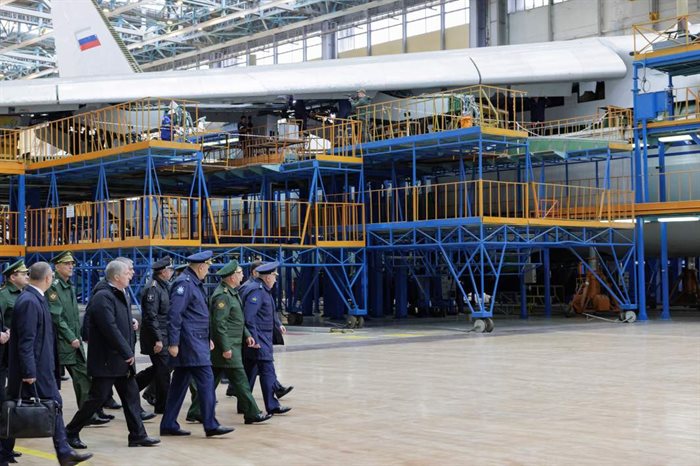 В цехе ремонта и сервисного обслуживания самолетов глава Объединенной авиастроительной корпорации Юрий Слюсарь доложил министру о проведении плановых работ на самолетах Ан-124-100 «Руслан». Сергей Шойгу спросил о том, какой тип двигателей планируется устанавливать на перспективные модели тяжелых транспортных самолетов, а также при проведении ремонта и модернизации «Русланов».