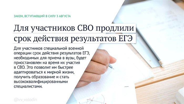 Для участников специальной военной операции срок действия результатов ЕГЭ, необходимых для приема в вузы, будет приостановлен на время их участия в СВО. Это позволит им быстрее адаптироваться к мирной жизни, получить образование и стать высококвалифицированными специалистами.