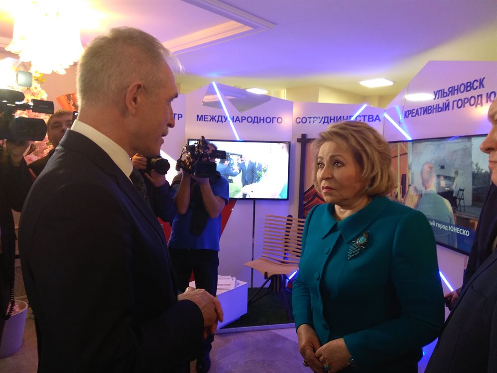 А гидом по экспозиции региона для Валентины Ивановны выступил сам губернатор Сергей Морозов. Вместе с председателем СФ выставку осмотрели ульяновские сенаторы Сергей Рябухин и Вадим Харлов. Глава области пригласил спикера Совета Федерации посетить первый всемирный фестиваль боевых искусств ТАФИСА, который пройдёт в сентябре в Ульяновске. Получила Валентина Матвиенко и приглашение на фестиваль «Японская весна на Волге».