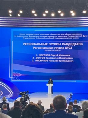 Решением съезда, опять же, как и было объявлено ранее, региональную группу кандидатов № 23 (Ульяновская область) возглавил экс-губернатор Сергей Морозов. Вслед за ним идут занявшие второе и третье места на праймериз после Кононова депутаты Законодательного собрания области Константин Долгов и Николай Мясников.