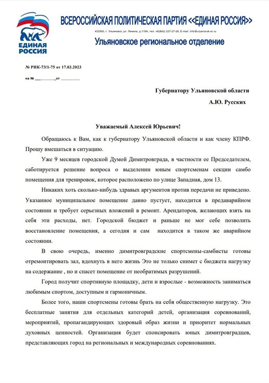 В региональных телеграм-каналах появился скан письма секретаря регионального отделения «Единой России» Владимира Камеко главе Ульяновской области Алексею Русских с просьбой вмешаться в ситуацию с нежеланием городских властей Димитровграда передать спортсменам-самбистам помещение для занятий. В региональном отделении партии «Единая Россия» факт отправки официального обращения главе области подтвердили.