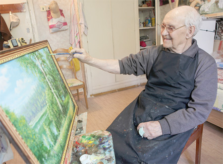 Мы застали Вишнева за мольбертом и красками. Михаил Александрович наносил последние штрихи на лесной пейзаж. Вся комната увешана его работами – мастерски написанными репродукциями известных картин, портретов родственников и иконами.