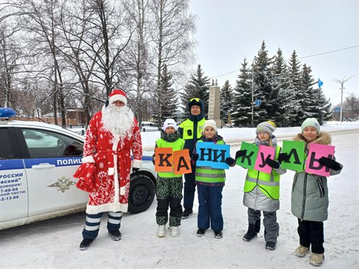 Полицейский Дед Мороз и активисты Ишеевского многопрофильного лицея для профилактики детского дорожно-транспортного травматизма в период зимних каникул на территории Ишеевки провели профилактическую акцию «Внимание: каникулы».